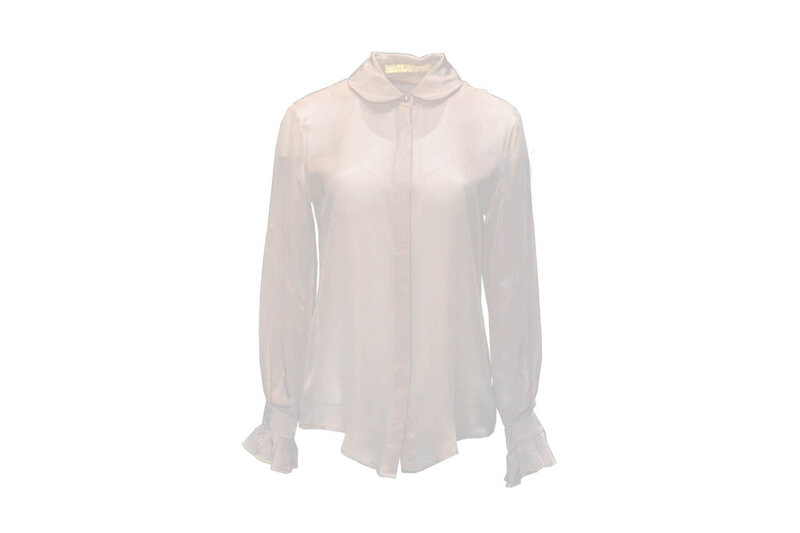 Camicia Angel realizzata in delicata seta pura seta, collo classico tondo, bottoni in perla, polsini con balzine in pieghe, stile bon ton, chiusura frontale con bottoni nascosti, tinta unita. 100% seta. Ottima Fattura e vestibilità.