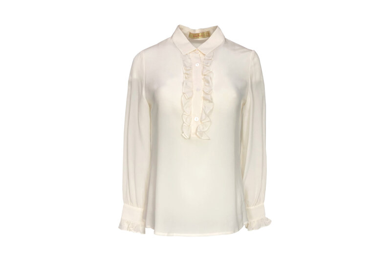 Camicia in 100% seta,con balzine davanti e nei polsini, collo a listino, bottoni madreperla visibili davanti e nei polsini.