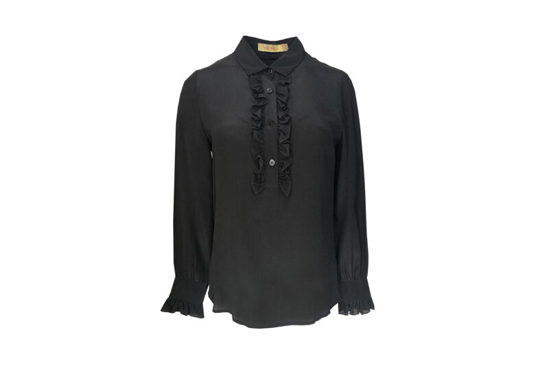 Camicia in 100% seta,con balzine davanti e nei polsini, collo a listino, bottoni madreperla visibili davanti e nei polsini.